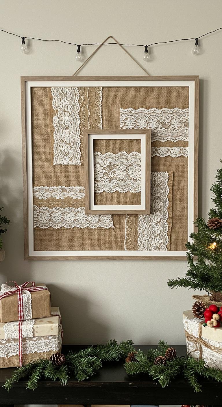 If you’re looking to add a rustic charm to your holiday decor, DIY burlap and lace wall art is a perfect choice.