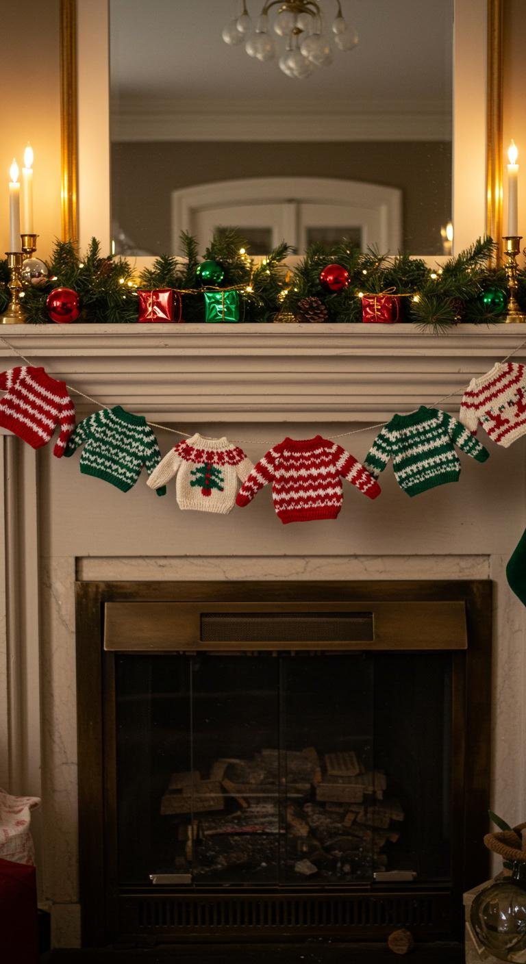 Imagine tiny knit sweaters adorned with vibrant holiday colors and delightful sweater patterns, elegantly strung together. This eye-catching decor adds a whimsical touch, inviting joy and nostalgia.