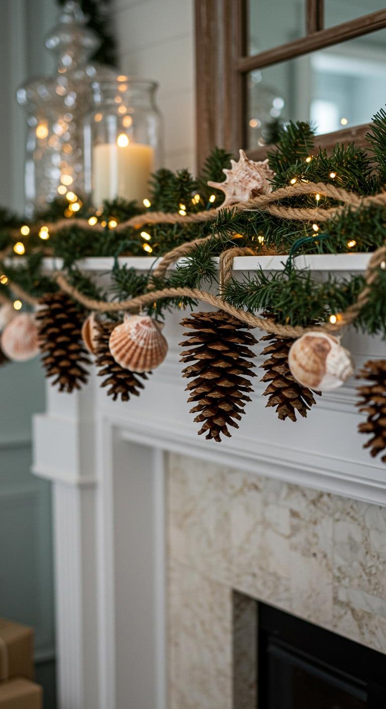 Imagine creating a stunning pinecone garland adorned with seashells and rope, perfect for draping across your mantel.