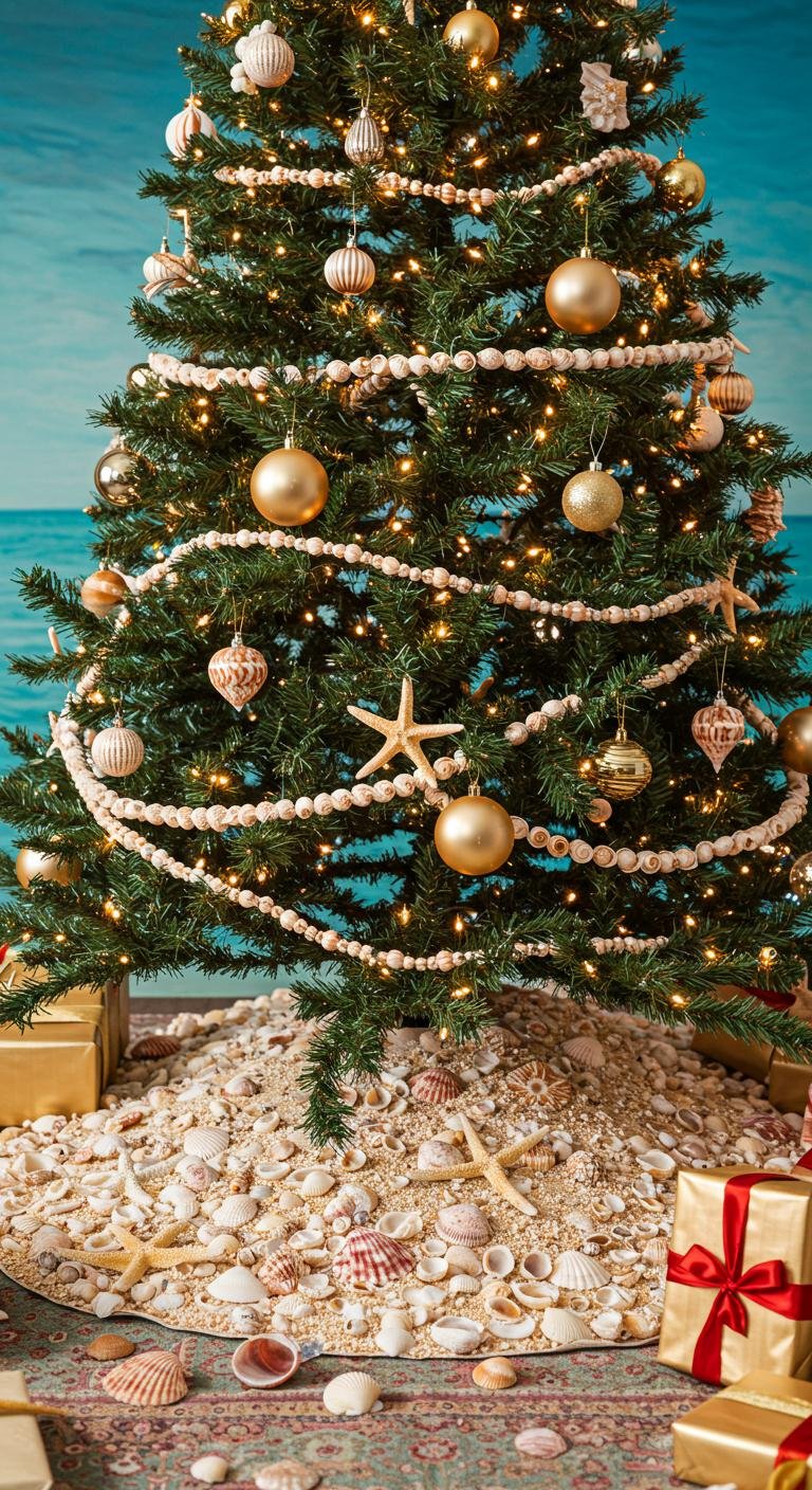 Imagine a Christmas tree that stands majestically against a backdrop of ocean blues, adorned with a seashell-trimmed skirt that brings the beach to your festive celebration.