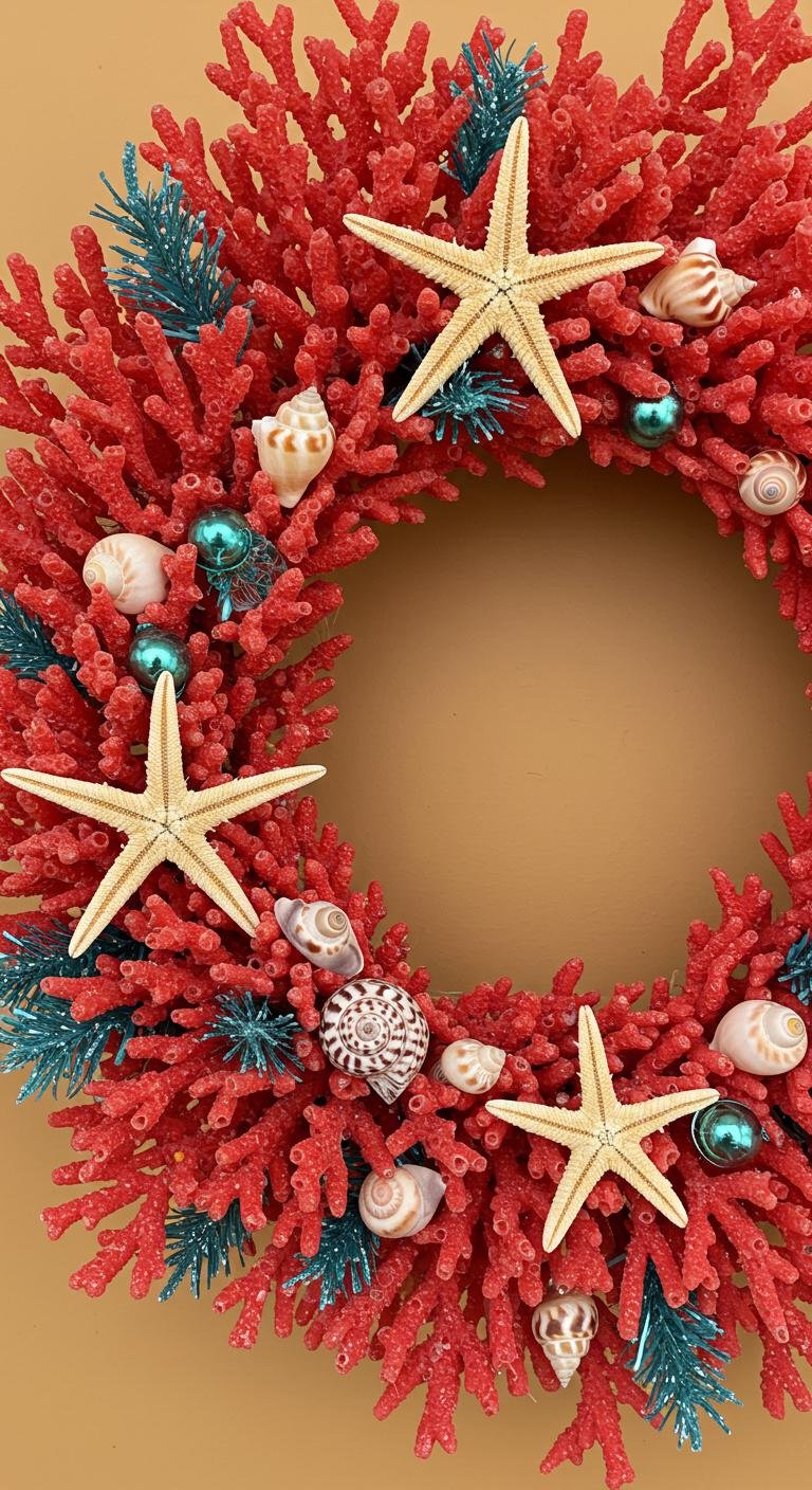 Embrace a vibrant coral color scheme, weaving in seashells and starfish as wreath embellishments. This lively creation reflects the essence of the beach, infusing your holiday space with warmth and tranquility.