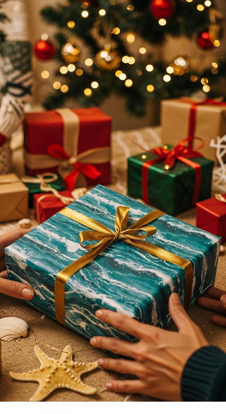 This playful coastal gift wrapping adds a splash of beachy bliss, making your thoughtful treasures feel even more special under the twinkling holiday lights.