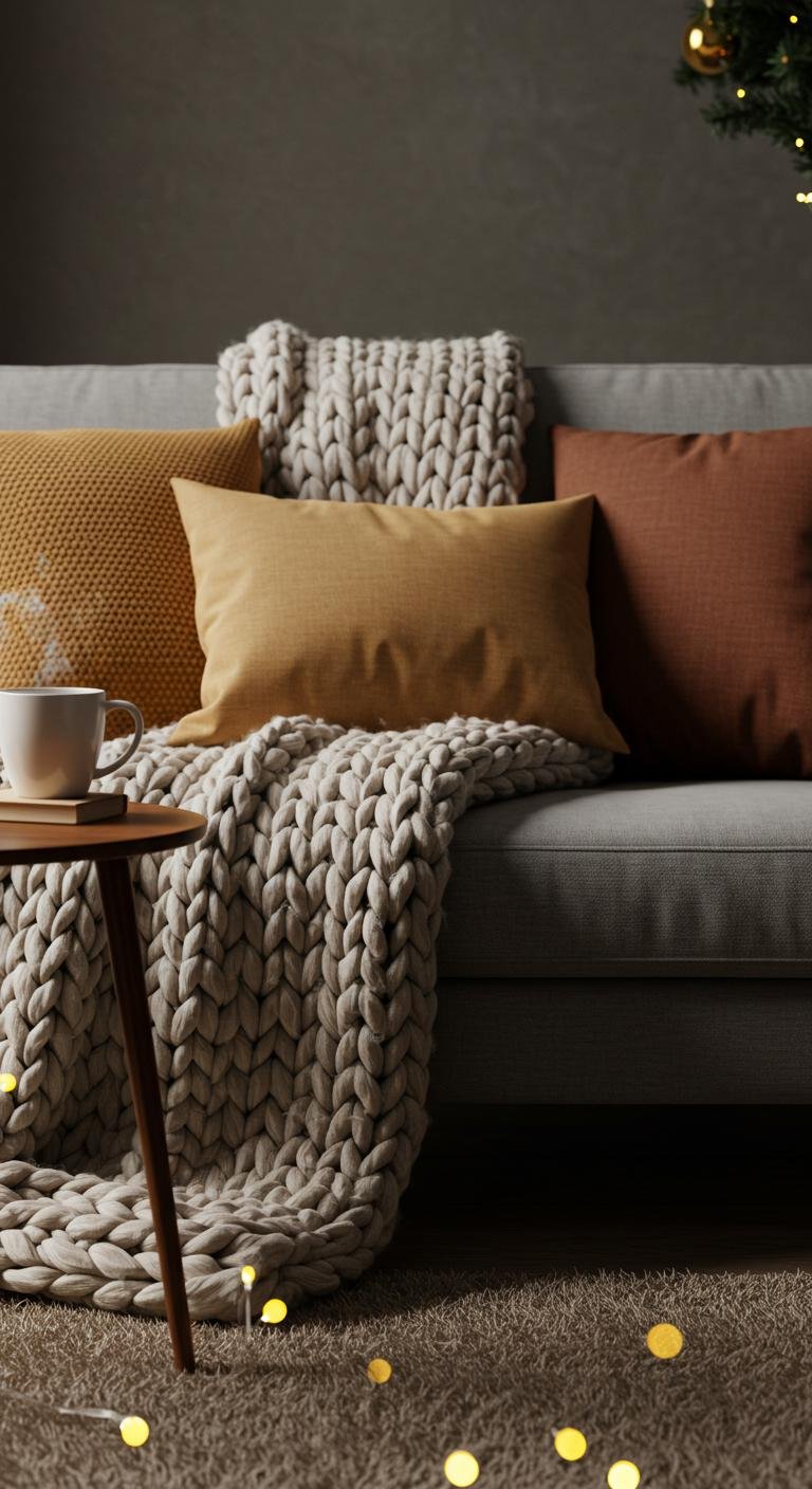 There’s nothing like snuggling under a big chunky knit blanket when it’s cold outside. I’m obsessed with those deep reds and creamy hues—they just scream holiday coziness. And honestly, whether you grab one ready-made or try your hand at knitting (it’s easier than you think!), layering these on your couch or favorite chair instantly makes the space feel so much warmer. Bonus? They look adorable tossed in a cute basket too, making your festive setup look effortlessly put together.