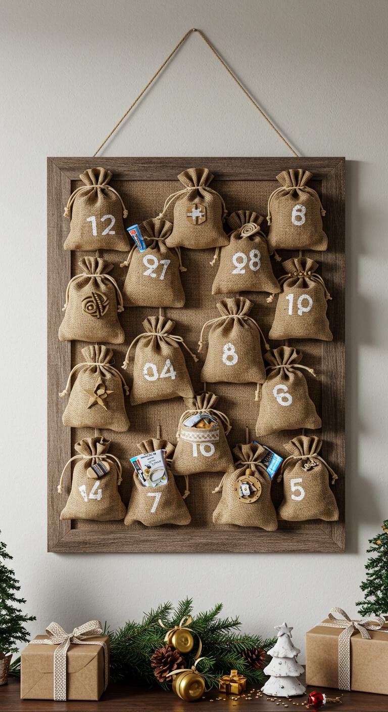 Advent calendars are such a fun way to build holiday excitement with the family. Try making your own with little burlap bags pinned to a wooden frame—each filled with tiny goodies or sweet notes. Label each bag with rustic tags and let the kids help pick what goes inside. It adds that extra layer of joy and anticipation every day leading up to Christmas, turning the countdown into a real festive event.