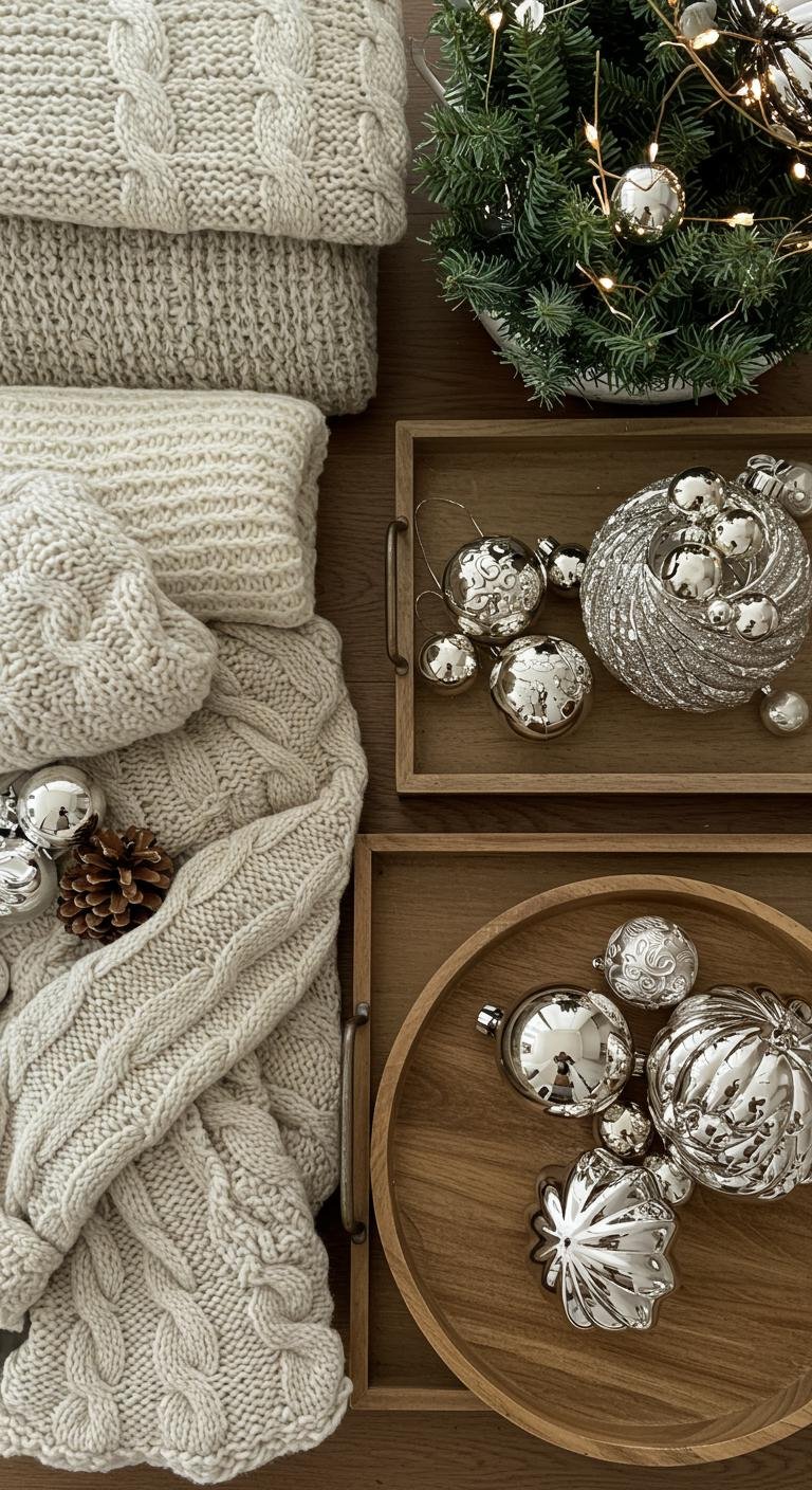 Mixing different textures is one of those tricks that makes a room instantly feel cozy and well-thought-out. Combining wood, fabric, and ceramics brings depth and keeps things visually interesting. Imagine a plush knit throw paired with a wooden tray full of shiny and matte ornaments. It’s all about balance, mixing softness with rustic roughness, so the space looks inviting and perfectly put together for the holidays.