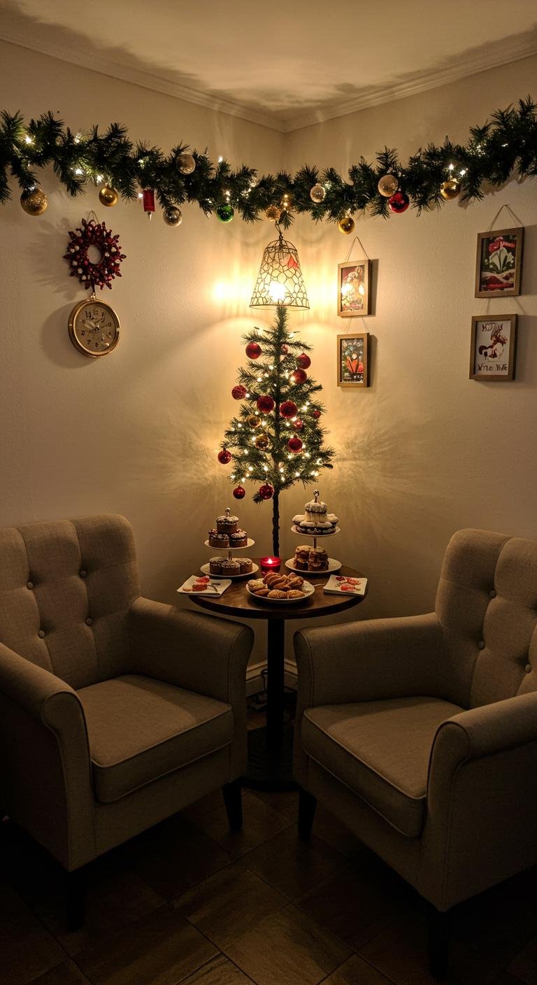 I’m all about carving out a snug little corner for family chill time. Grab a plush armchair or a small sectional, pile on soft blankets, and add warm, gentle lighting. Toss in a few holiday-themed throw pillows or a fun wall hanging, set an easy-to-reach side table with some treats, and boom—you’ve got the perfect spot for sharing holiday stories and sipping cocoa. Bonus points if it’s near the tree—you know, for that extra cozy twinkle.