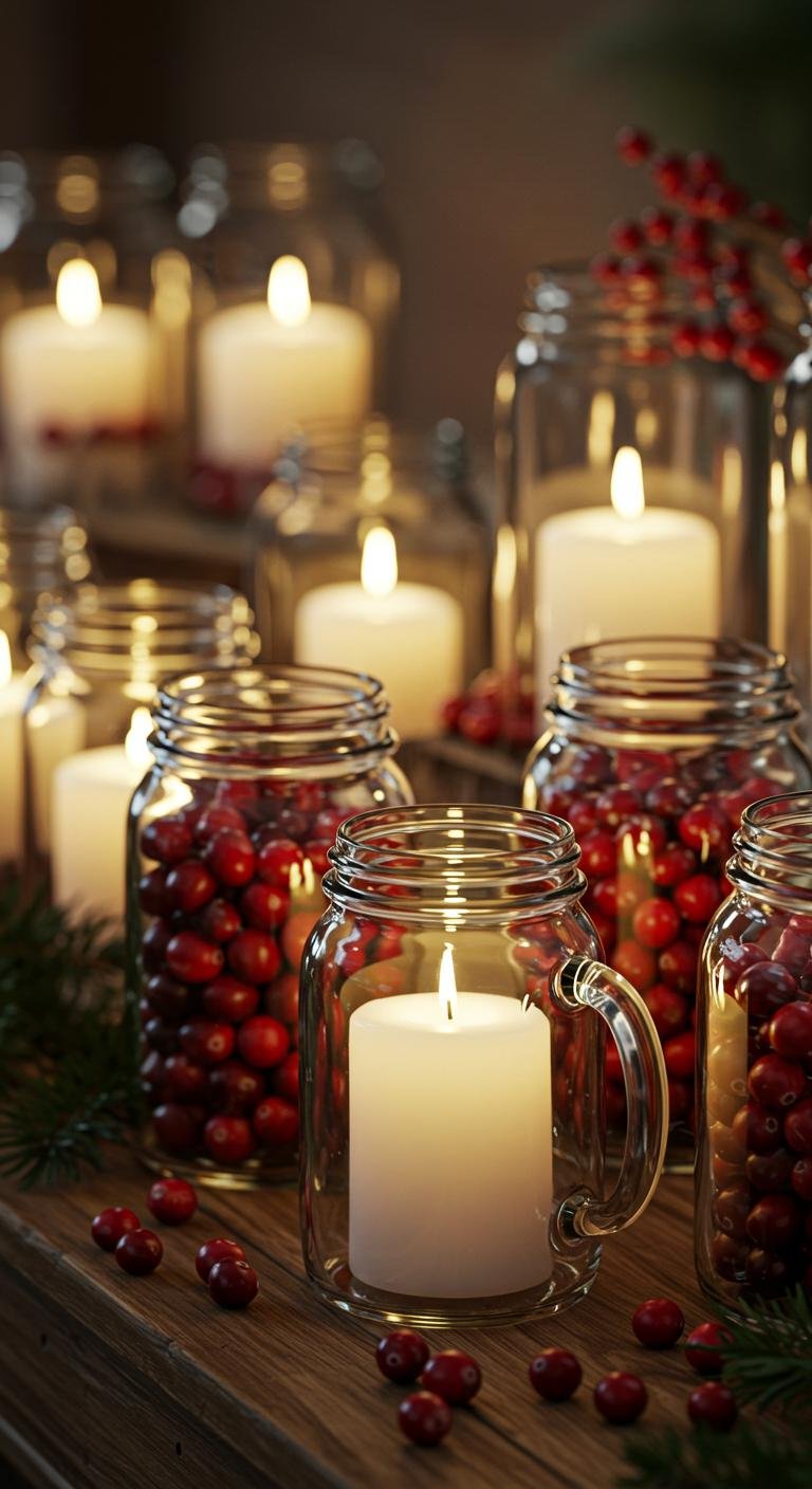 Mason jars are honestly the Swiss Army knife of holiday decorating. Fill them up with cranberries, pine sprigs, or even little votive candles, then tie on a plaid ribbon to nail that country look. Whether perched on a windowsill or gathered as a centerpiece, mixing different jar sizes adds visual interest. They’re simple, charming, and can be dressed up or down depending on your vibe.