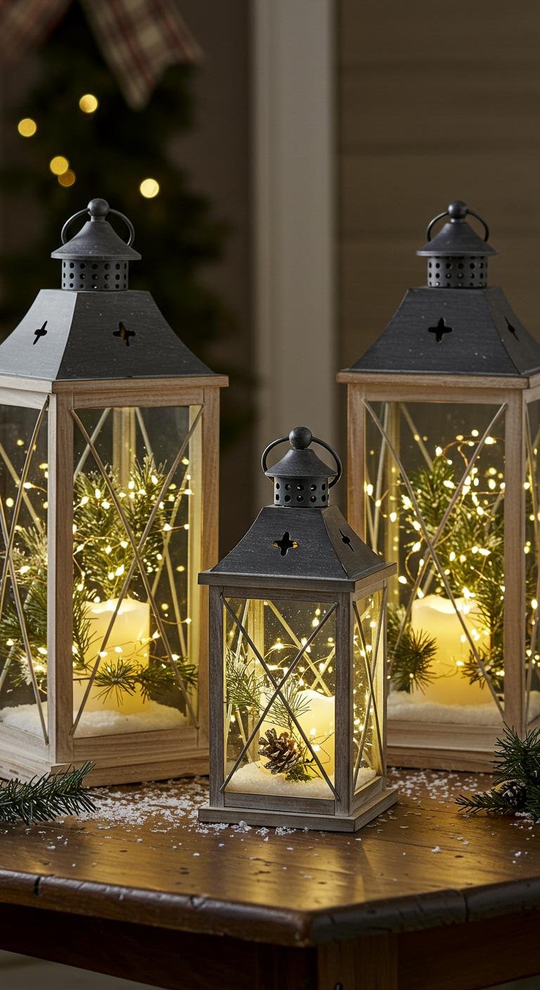 Lanterns are another timeless way to add that perfect winter warmth. Fill ’em up with faux snow, greenery, and strings of lights, and place them on porches or tables for that cozy holiday feel. Thrift shops often have inexpensive options you can refresh with a little paint for rustic charm. They’re super easy to make look inviting and bring that magical cabin vibe right to your home.