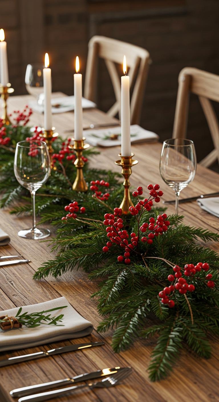 Centerpieces get a fresh, festive boost when you add berries. Use fresh or faux ones mixed with evergreen branches and arrange them in baskets or bowls for a bright, inviting touch. To keep costs low, forage natural bits from your yard or a local park. Scatter some twinkle lights around, and voilà—you’ve got a centerpiece that radiates warmth and joy.