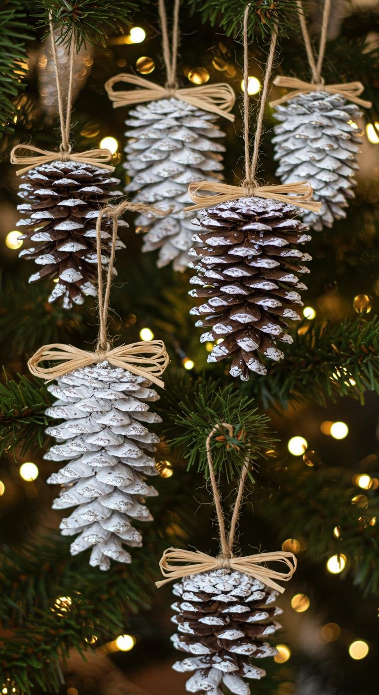 Here’s an easy and super charming idea: turn those plain pine cones into homemade ornaments. Head out to a local park or your backyard to gather some, clean them up, and then get creative. Paint them with festive shades or sprinkle a little glitter for some sparkle. Attach a loop of twine so you can hang them effortlessly. Bonus points if you write names or sweet messages on them — this makes for a fun family activity and personal touch on your tree. Plus, this project is super kid-friendly and budget-wise!
