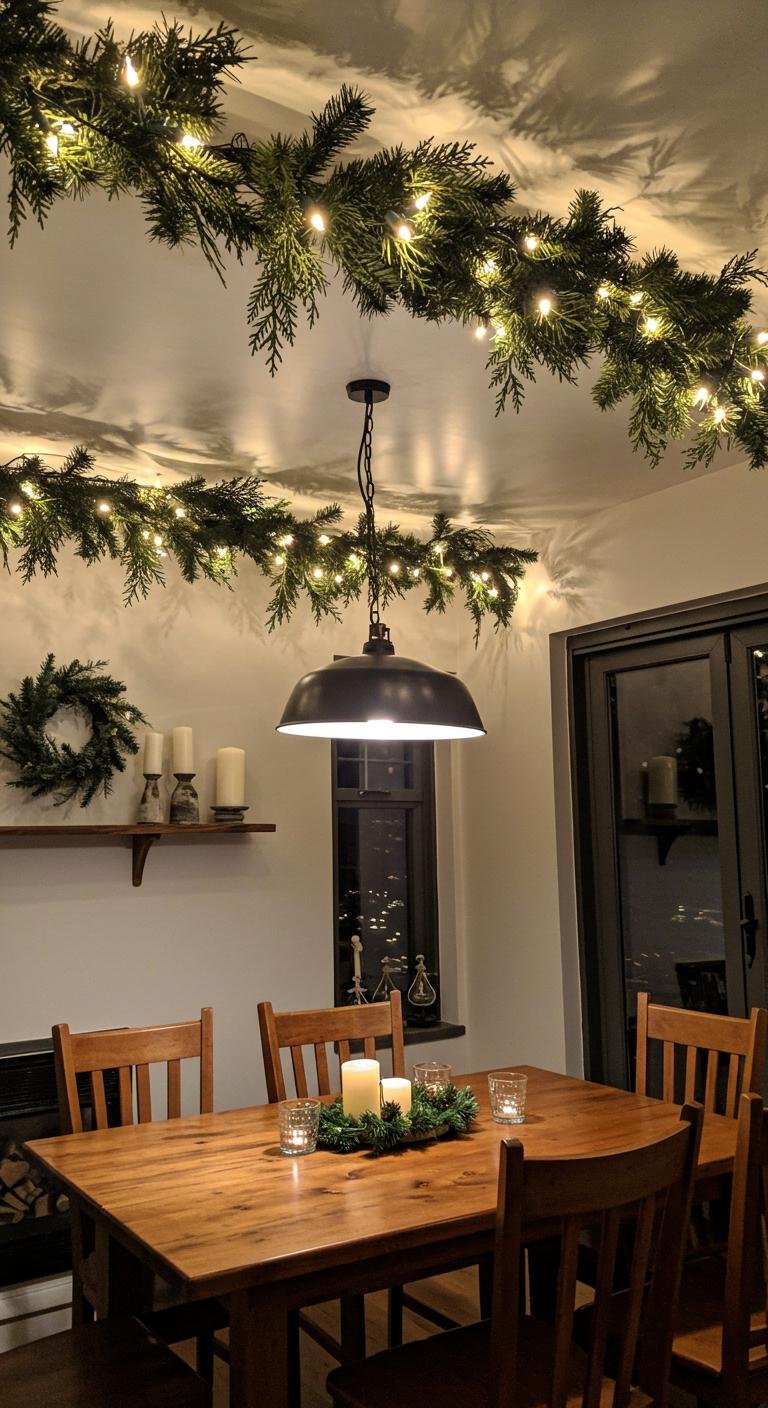 Make a statement by decorating your ceiling with a garland made from fresh or faux evergreen branches. Twist the branches together with floral wire, weave in twinkly lights, and hang it above your dining or living space. It instantly creates a warm, natural holiday vibe and doubles as a stunning backdrop for festive gatherings. It’s surprisingly easy to do and really amps up the cozy factor.