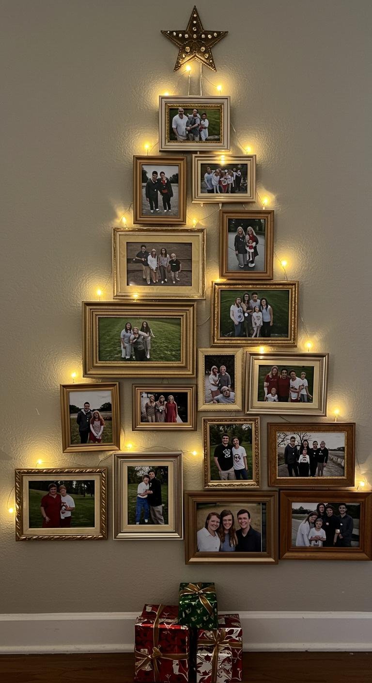 Got a stash of old photo frames? Arrange and secure them into a Christmas tree shape, then fill each frame with family photos or festive prints. Add a string of lights draped around for that perfect glow. This clever project recycles old items and turns them into a meaningful holiday focal point — your memories twinkling right along with the lights.