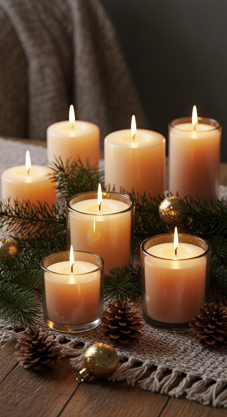 Candles seriously change the whole mood for any festive gathering. Grab a bunch of affordable candles in different sizes—you can find great ones at discount stores—and arrange them on a cute tray or a rustic wooden board for that layered, warm feel. Surround them with pine branches or pinecones to amp up the natural cozy vibe. I even love the idea of filling a clear jar with little candles for an elegant touch. Here’s a fun trick: if you’ve got old candle holders lying around, paint them gold or silver for a festive sparkle that doesn’t cost a thing. Trust me, it makes every corner glow with warmth.