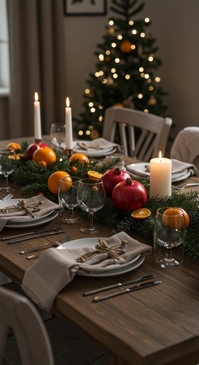 Nothing beats a centerpiece that feels like a little slice of the forest inside your home. Collect pine branches, seasonal fruits, or acorns, and arrange them in a simple bowl or mason jar right in the center of your table. Add a few candles to set the mood, and voila—a beautiful display that’s both fresh and affordable. A clever touch? Use brown paper as a table runner beneath it all for that rustic, laid-back vibe that just screams cozy holiday.