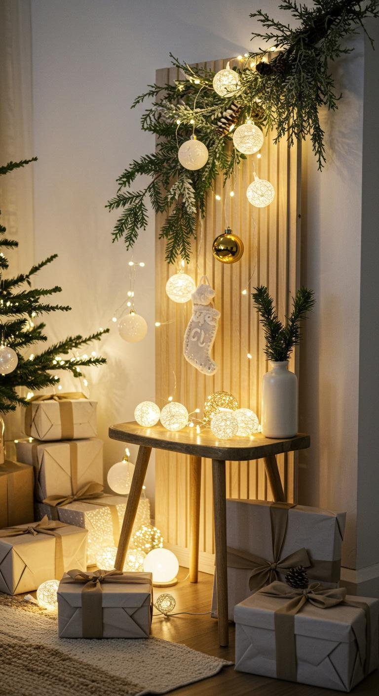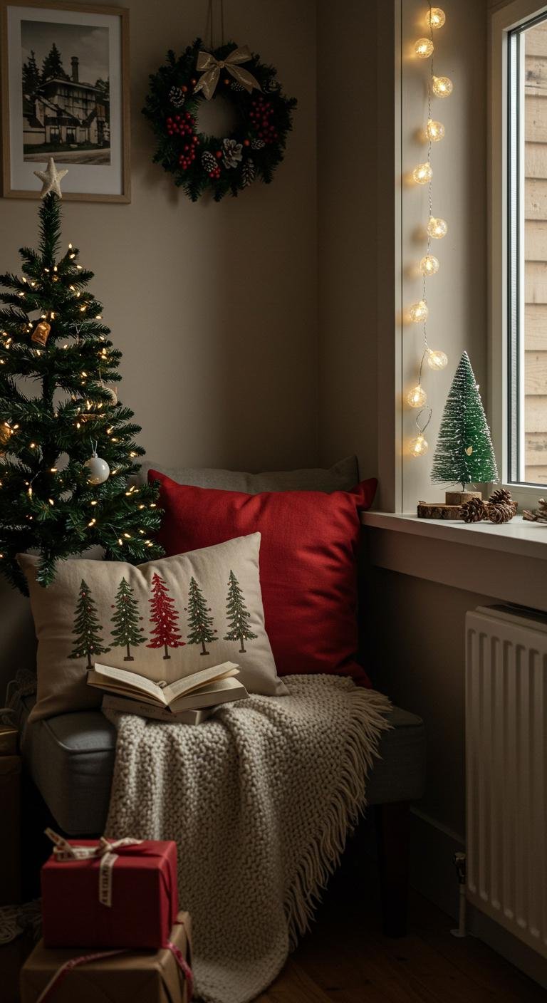 Got a little unused spot in your home? Turn it into a snug holiday nook! Think plush pillows, a soft throw, and a mini tree twinkling with fairy lights. This becomes your go-to retreat for sipping hot cocoa and soaking in the festive feels. Add small touches like scented candles or your favorite Christmas reads to sweeten the vibe. An easy DIY wreath hanging near by can tie the whole space together. It’s a cozy little escape amid the holiday buzz and totally worth carving out.