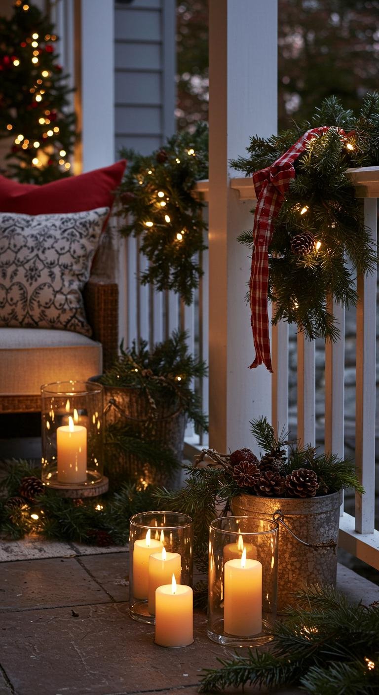 Nothing says cozy Christmas porch quite like the soft glow of candles and lanterns. Scatter rustic lanterns along steps or on tables to guide guests with gentle light. Flameless candles are my top pick for outdoors since they keep things safe but still flicker with charm. Surround these little lights with garlands or fresh greenery to level up the whole look. Placing larger lanterns near your entrance with smaller ones peppered around creates a magical, welcoming vibe. Feeling crafty? You can even make your own lanterns from glass jars, twine, and candles. That warm glow will have everyone lingering just a little longer.