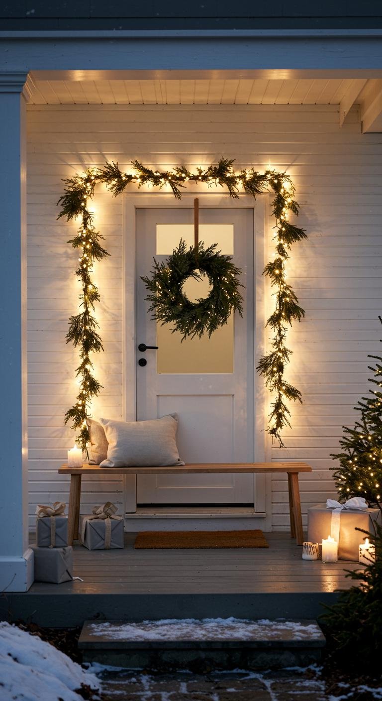 Sometimes less really is more, and the timeless simplicity theme proves it. This style leans on fresh greenery like pine or cedar, letting natural textures shine without going overboard. A sprinkling of soft white lights creates warmth without stealing the show, and a simple wreath fits right in with the minimalist vibe. Add in clean lines—like a wooden bench with a couple of plain fabric pillows—and the whole porch feels effortlessly inviting. Making your own wreath with backyard materials or simple craft supplies not only keeps costs low but makes your porch uniquely yours.