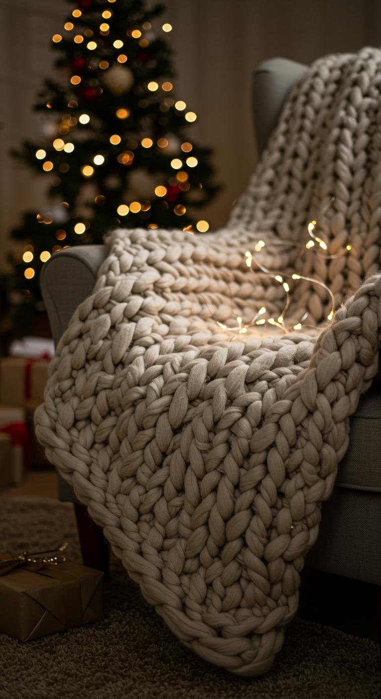 Chunky knit throws are pure comfort gold. Toss one over the couch or an armchair in neutral shades to blend seamlessly with your farmhouse vibe. If you’re feeling adventurous, knit one yourself — it adds a personal, heartwarming touch. Trust me, softness and texture like this invite you to sit back and soak in the holiday spirit.