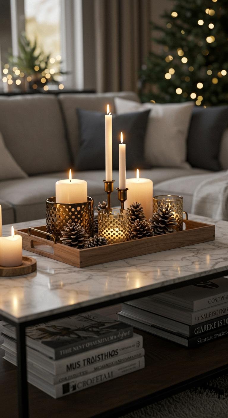 Pick a coffee table tray that mixes materials like wood and metal to bring in interesting textures. Fill it with candles, pinecones, and ornaments for a festive centerpiece that’s simple but stunning. Use what you already have and swap pieces around to keep it fresh. Whether it’s minimalist or layered, this little display pulls your whole room together.