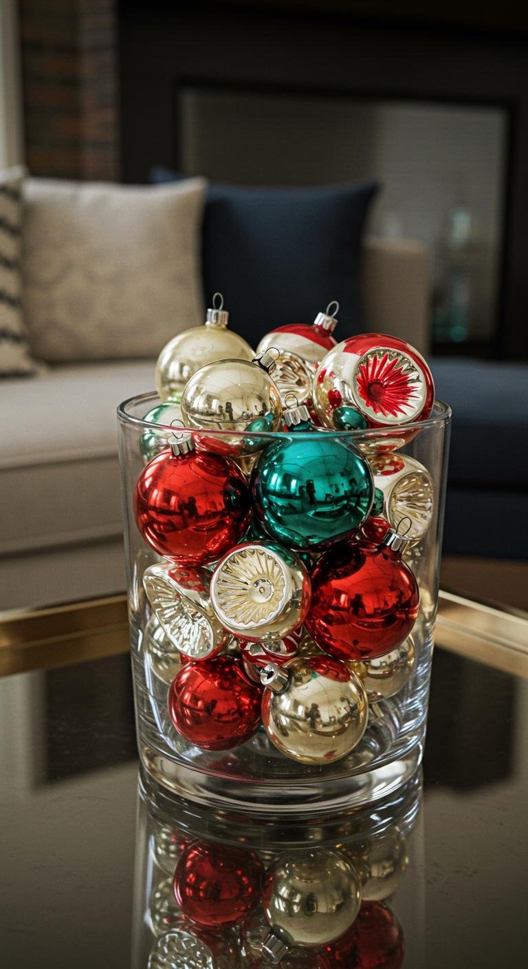 Nothing tugs at the heartstrings like vintage ornaments filled with stories. Whether they’re family heirlooms or quirky thrift store finds, displaying them in glass bowls or cloches makes for a stunning holiday vignette. You can also adorn a mini tabletop tree or mix them in with your main tree for a sentimental vibe. These treasures bring warmth, history, and a little extra twinkle to your living room.