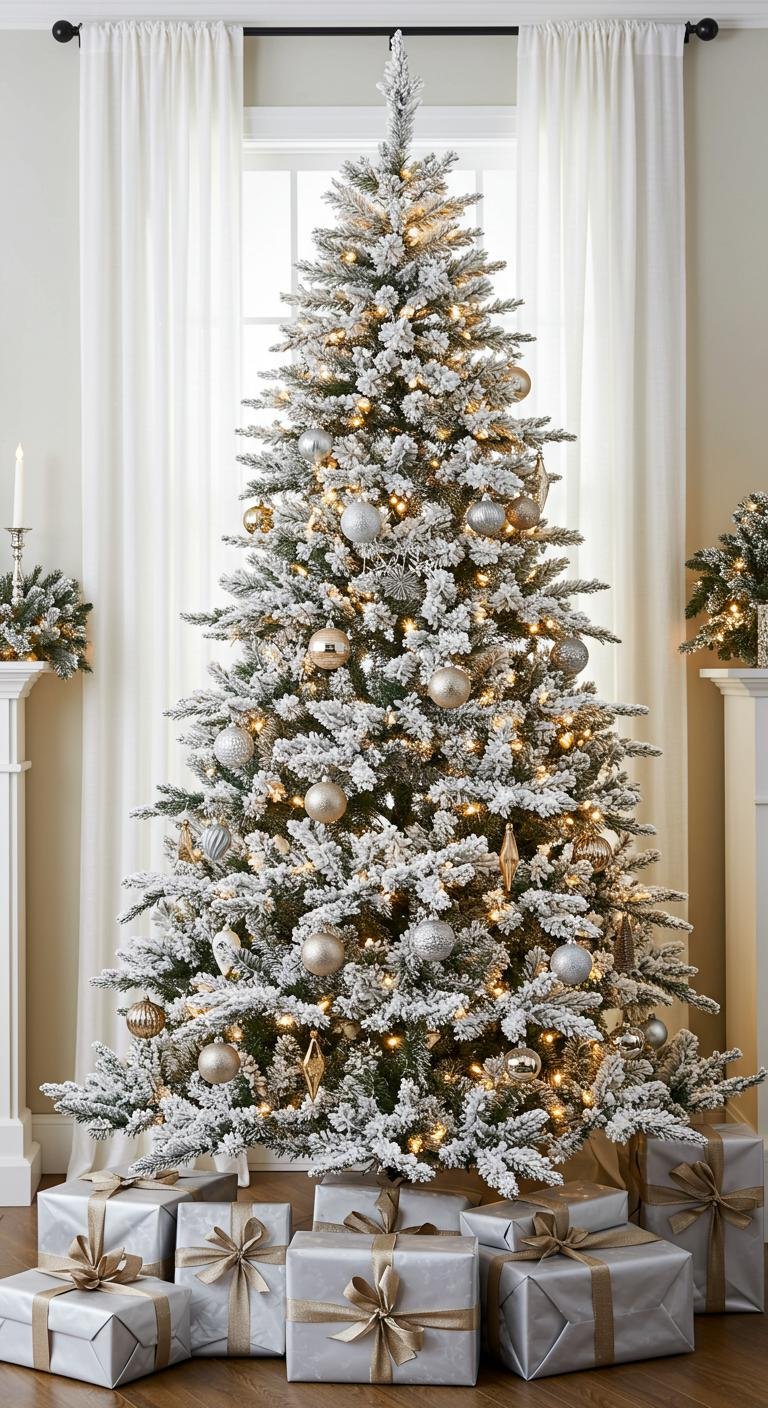 There’s something magical about a flocked tree—it’s like bringing a little snow-covered forest indoors. The creamy white flocking softens everything and pairs beautifully with warm twinkle lights. Feeling crafty? Make your own flocked effect by lightly spraying branches with white paint and sprinkling on some Epsom salt to mimic freshly fallen snow. Budget-friendly and beautiful!