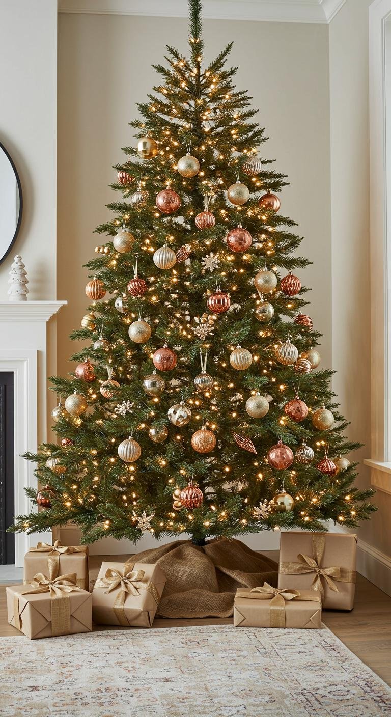Metallics like copper, soft gold, and terracotta bring just the right amount of glow to a neutral tree. This subtle glam adds warmth without stealing the show. If you want to try DIY, grab some inexpensive ornaments and spray paint them in your favorite metallic shade — instant elegance at a fraction of the cost!