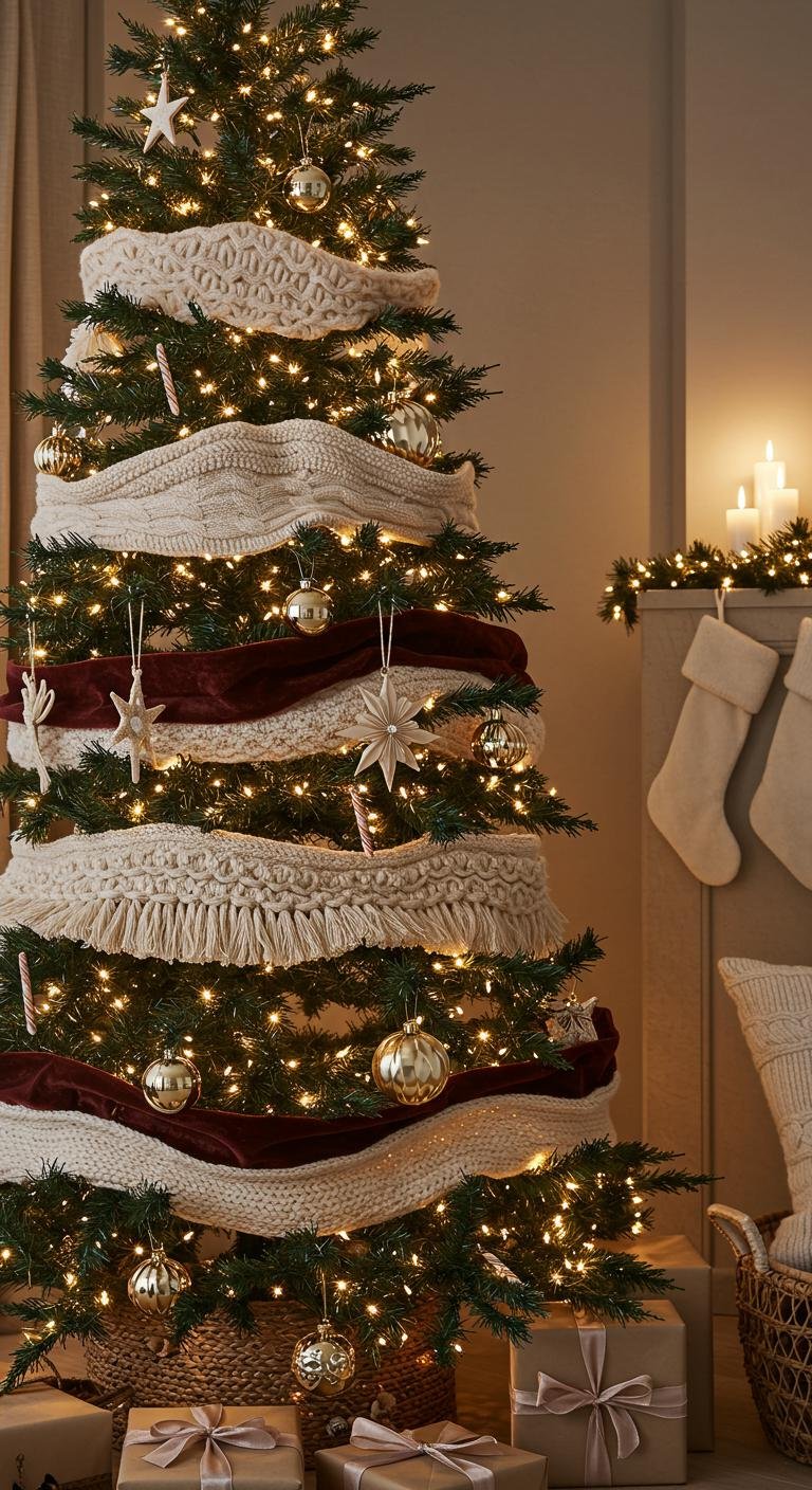 Think velvet ribbons, chunky knits, and soft fabrics layered throughout your tree. These cozy elements add depth and make everything feel welcoming. Feeling crafty? Turn thrifted sweaters or fabric scraps into garlands or ribbons. Not only is it budget-friendly, but it’s also a super sustainable way to add warmth.