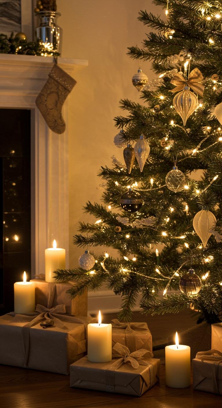 Nothing sets a mood like soft candlelight. Use LED candles safely nestled around the tree for that gentle glow, or—if you’re feeling brave—real flickering candles placed with care. You can even repurpose glass jars as elegant candle holders, adding atmosphere without blowing the budget.