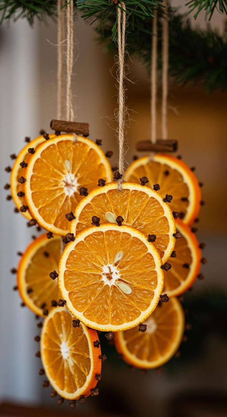 Citrus ornaments add fresh scents and bright colors. Slice oranges or lemons and dry them out, then poke in cloves to give a spiced look and lovely aroma. Thread with twine and hang on your tree or toss into potpourri bowls. They’re easy, affordable, and a fun way to let the kids join in on decorating while making your home smell amazing.