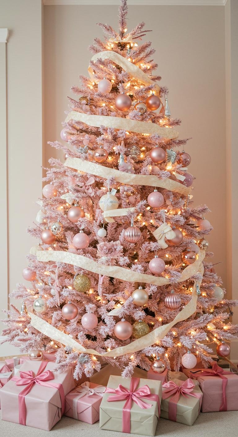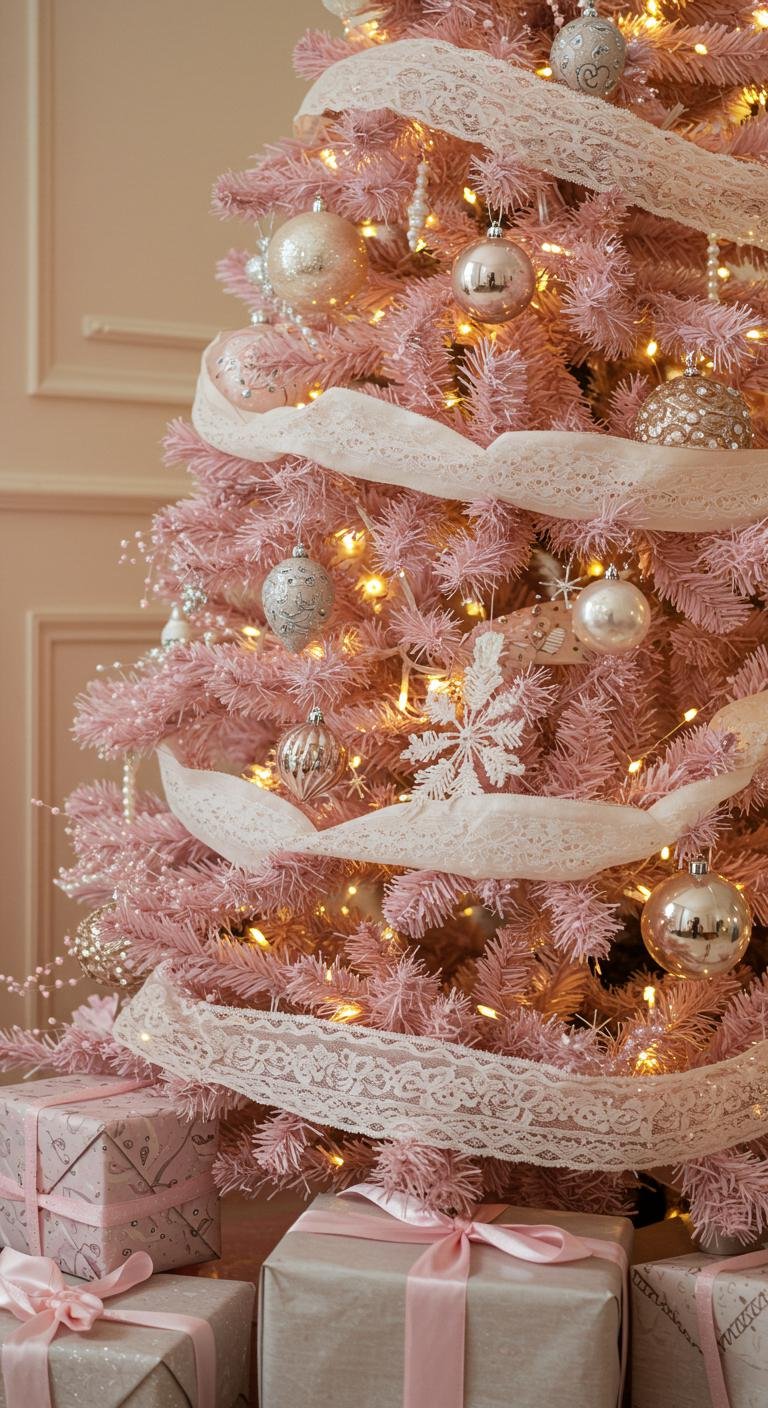 Bring out the romance with lace details and pearl-like ornaments that feel delicate and soft. Add warm white lights that twinkle just so, creating a cozy glow. For an extra heartwarming touch, throw in some DIY lace ribbons or handcrafted ornaments to personalize the vibe. It’s like your tree is giving you a gentle holiday hug.