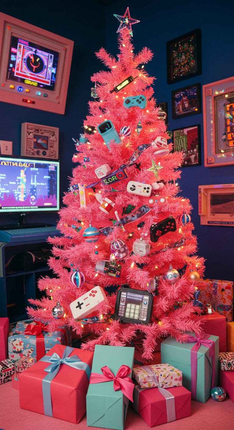 Got a soft spot for gaming? Go with retro pixelated icons and vibrant colors on your pink tree. Handmade ornaments inspired by your favorite games add a personal, playful touch. Top the tree off with DIY video game pieces and you’ve got a conversation starter that’s full of fun nostalgia.