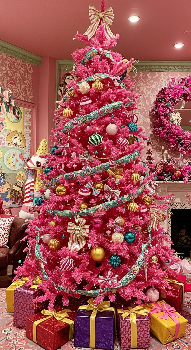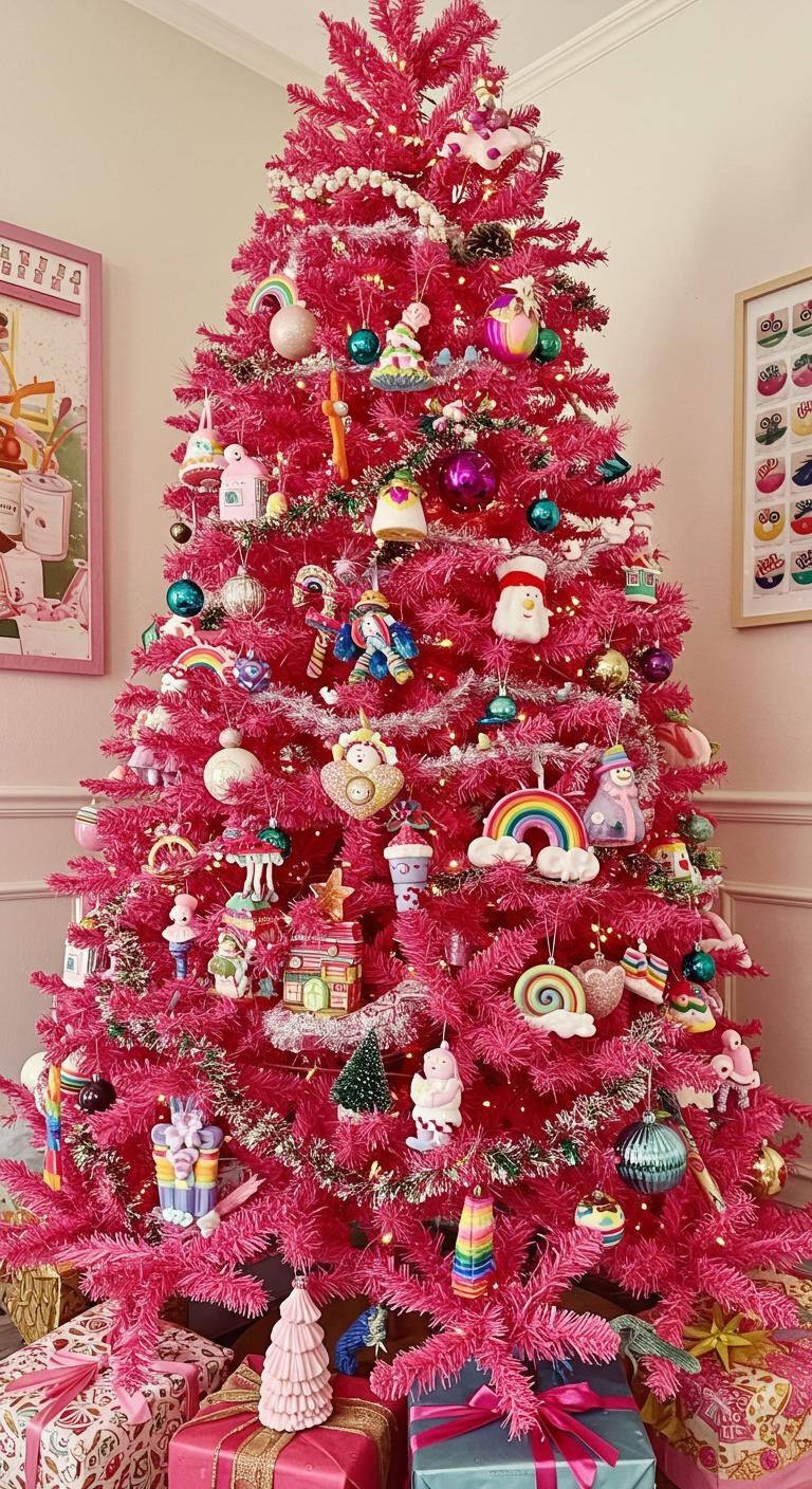 Take your pink tree on a whimsical rainbow journey by adding colorful ornaments that fade from pink into vibrant hues. Cascading rainbow garlands bring eye-catching fun, and you can DIY rainbow baubles by painting old ornaments with bright colors. The whole look is playful and sure to be the star of your holiday festivities.
