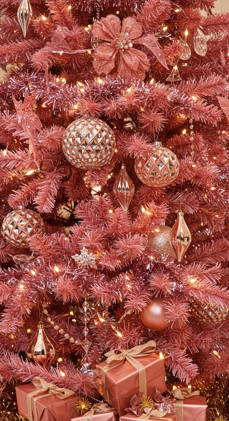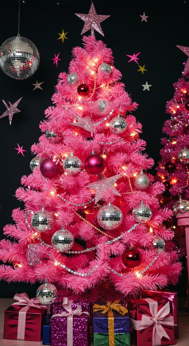 Ready to boogie? Deck out your pink tree with mini disco balls and sequined garlands that sparkle just right. Top it off with a dazzling tree topper decked in metallic shine and you’ve got yourself a party centerpiece. You don’t need to splurge—disco ornaments pop up at thrift shops and online for great prices. This look is all about bringing that festive, flashback energy to your holidays.