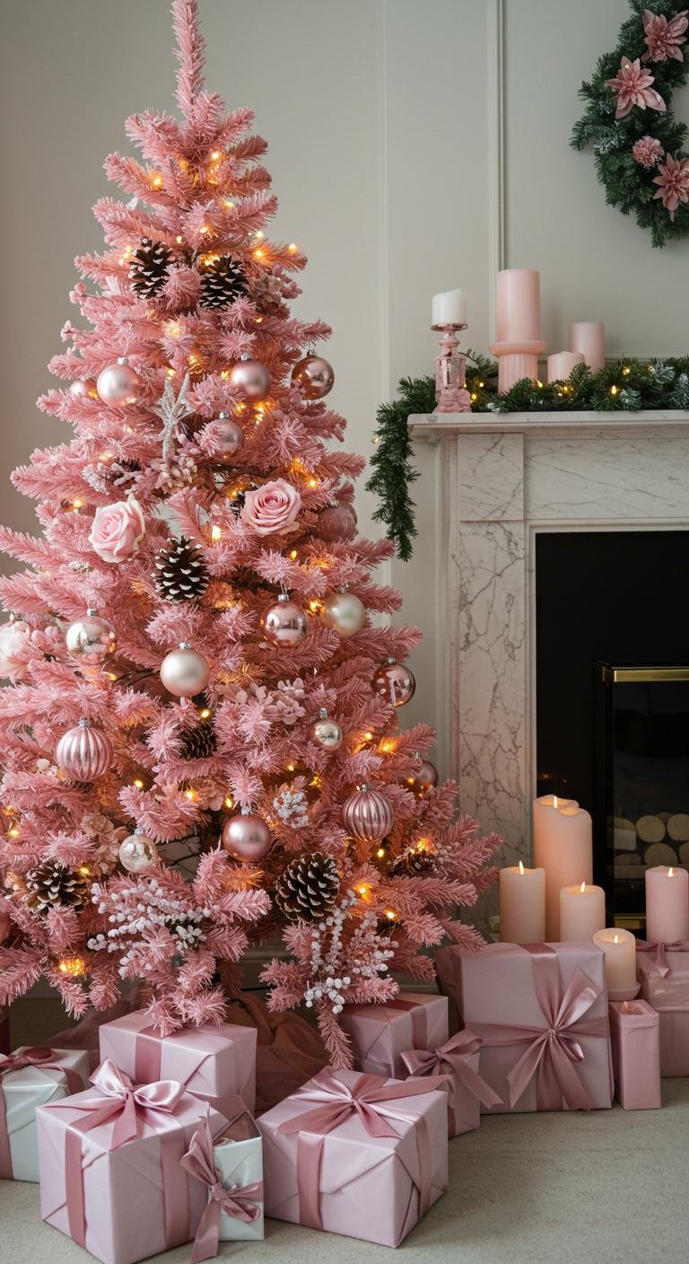 Want something gentle and warm? Pair your pink tree with pastel shades like mint green and lavender, plus soft whites to keep it soothing. Hit up thrift stores for pastel ornaments that won’t hurt your wallet, and surround the tree’s base with cozy throws for an inviting layered look. It’s like your tree is wrapped in a warm, pastel hug.