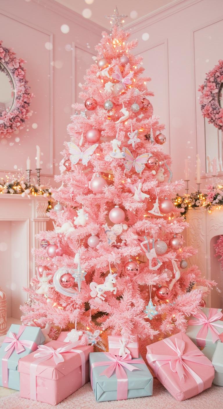 If you’re a sucker for whimsy, a fairytale-themed pink tree is calling your name. Think sparkly unicorn ornaments, delicate fairy lights, and pastel tones with star-shaped decorations sprinkled throughout. To keep that magic budget-friendly, try making your own felt stars or glittery butterflies. It’s the perfect dreamy setup to make your holidays feel a little more enchanted.