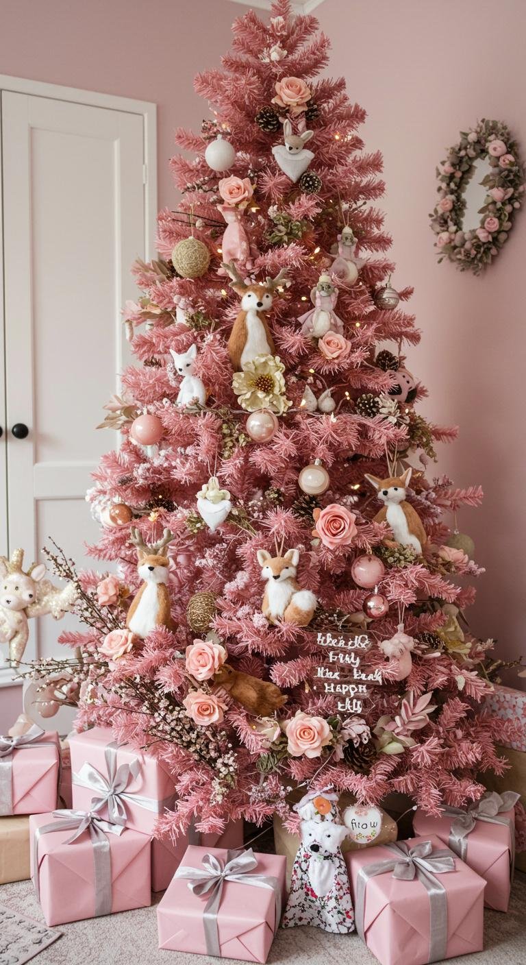 Channel forest magic with woodland critters like owls and deer, paired with soft florals and pinecones. These natural elements play beautifully against the pink backdrop and add loads of charm. You can even craft your own woodland ornaments using felt or faux fur to keep things sweet and budget-friendly. It’s that perfect mix of playful and rustic.