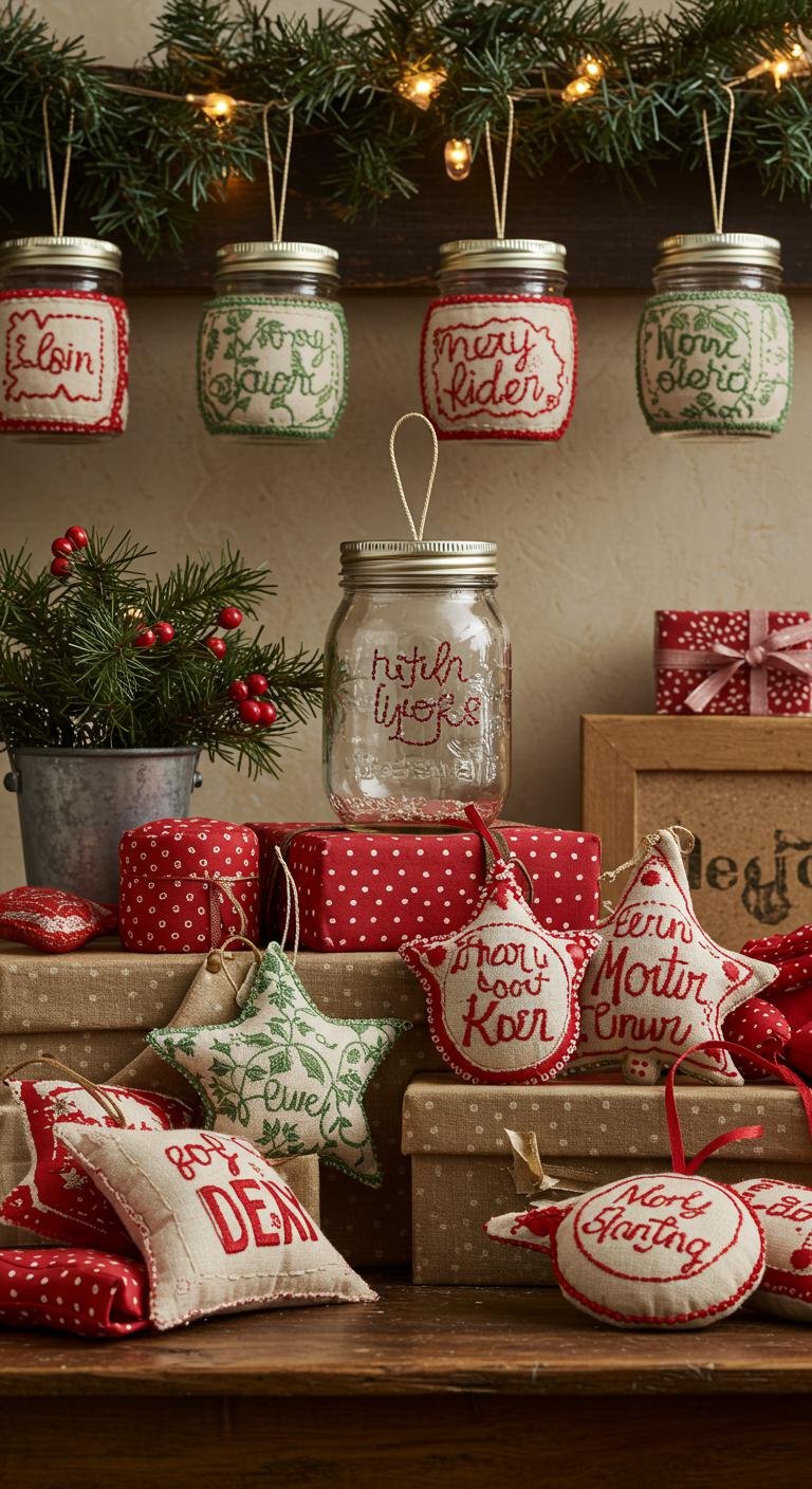 Crafting your own embroidered fabric ornaments can add a cozy touch to your holiday décor, just like those charming mason jar lid creations. Choose from vibrant cottons, soft felt, or luxurious silks to express your style. Use various embroidered techniques to create intricate patterns or personalized designs. Each ornament tells a story, letting your creativity shine bright, embracing the spirit of freedom and festivity.