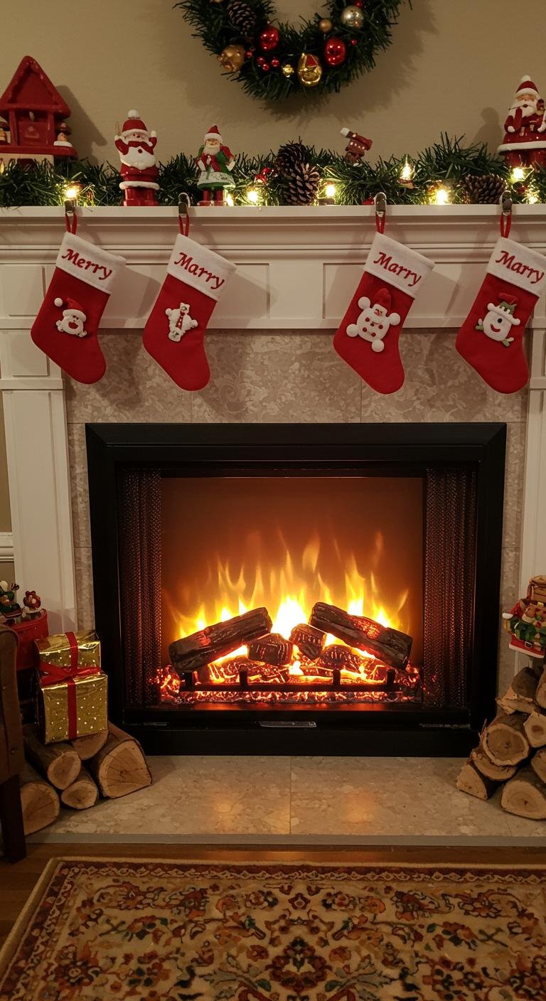 Use soft lighting, playful fireplace decorations, and mini stockings to enhance the cozy ambiance.