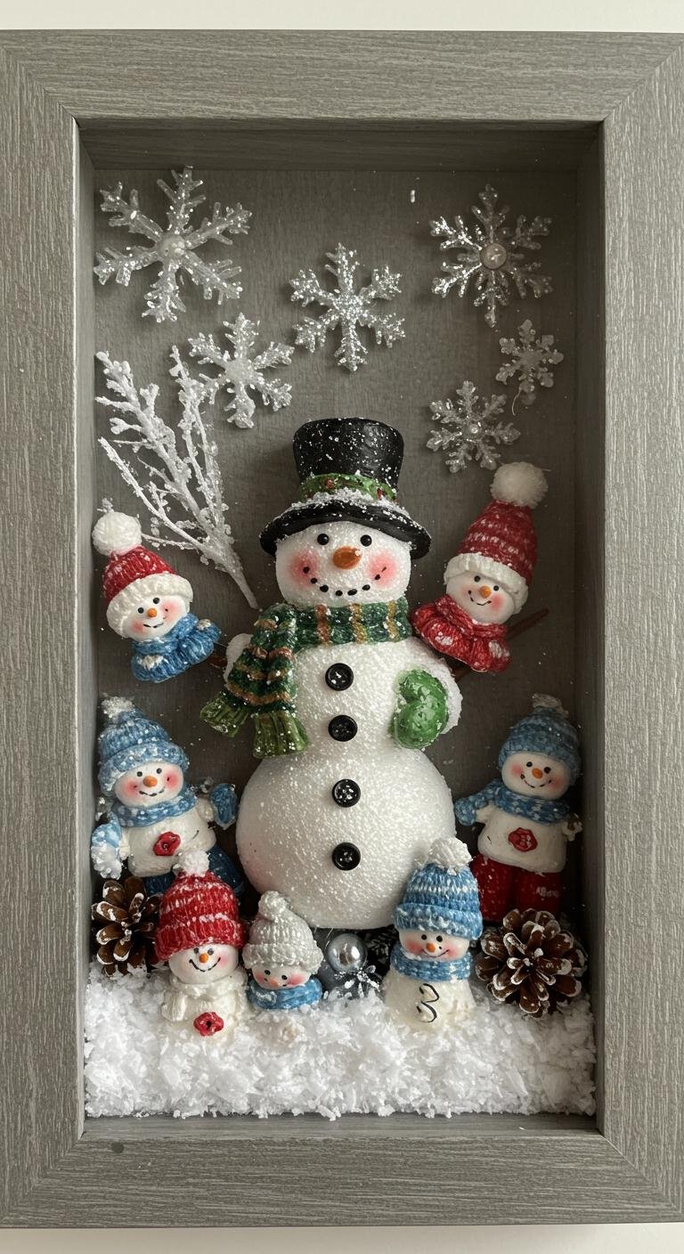 Create a delightful shadow box using cheerful snowman accessories, like tiny hats and scarves, surrounded by frosty decorations that glimmer with winter magic.