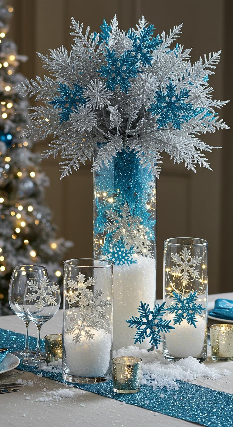 Combine elegant silver snowflake arrangements with vibrant blue snowflake accents, creating a festive atmosphere.