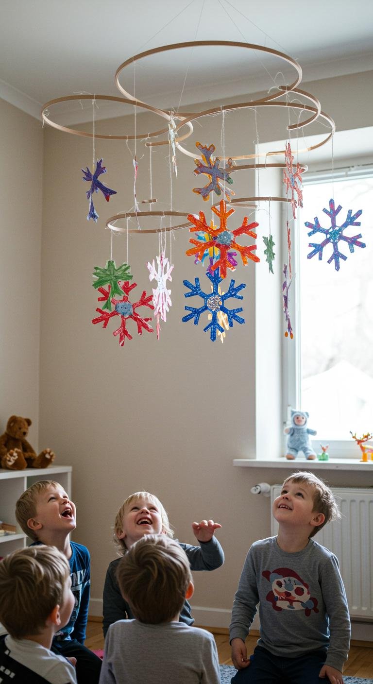 After creating stunning silver and blue snowflake centerpieces, it’s time to bring that whimsical winter charm into your child’s space with a delightful snowflake mobile. Use kid-friendly materials like paper, string, and wooden hoops for easy, fun crafting. Explore snowflake mobile ideas by letting your kids decorate each flake with paint or glitter. Hang it up, and watch their faces light up!