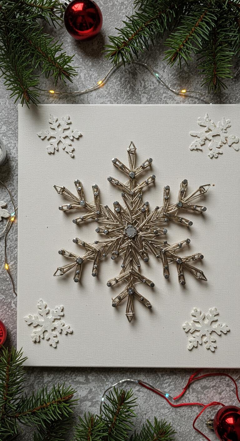 Simply choose snowflake patterns, trace them lightly onto a canvas, and then wrap string around nails to create stunning designs.
