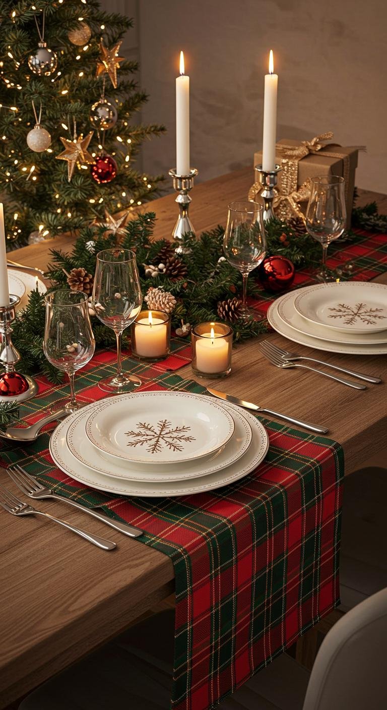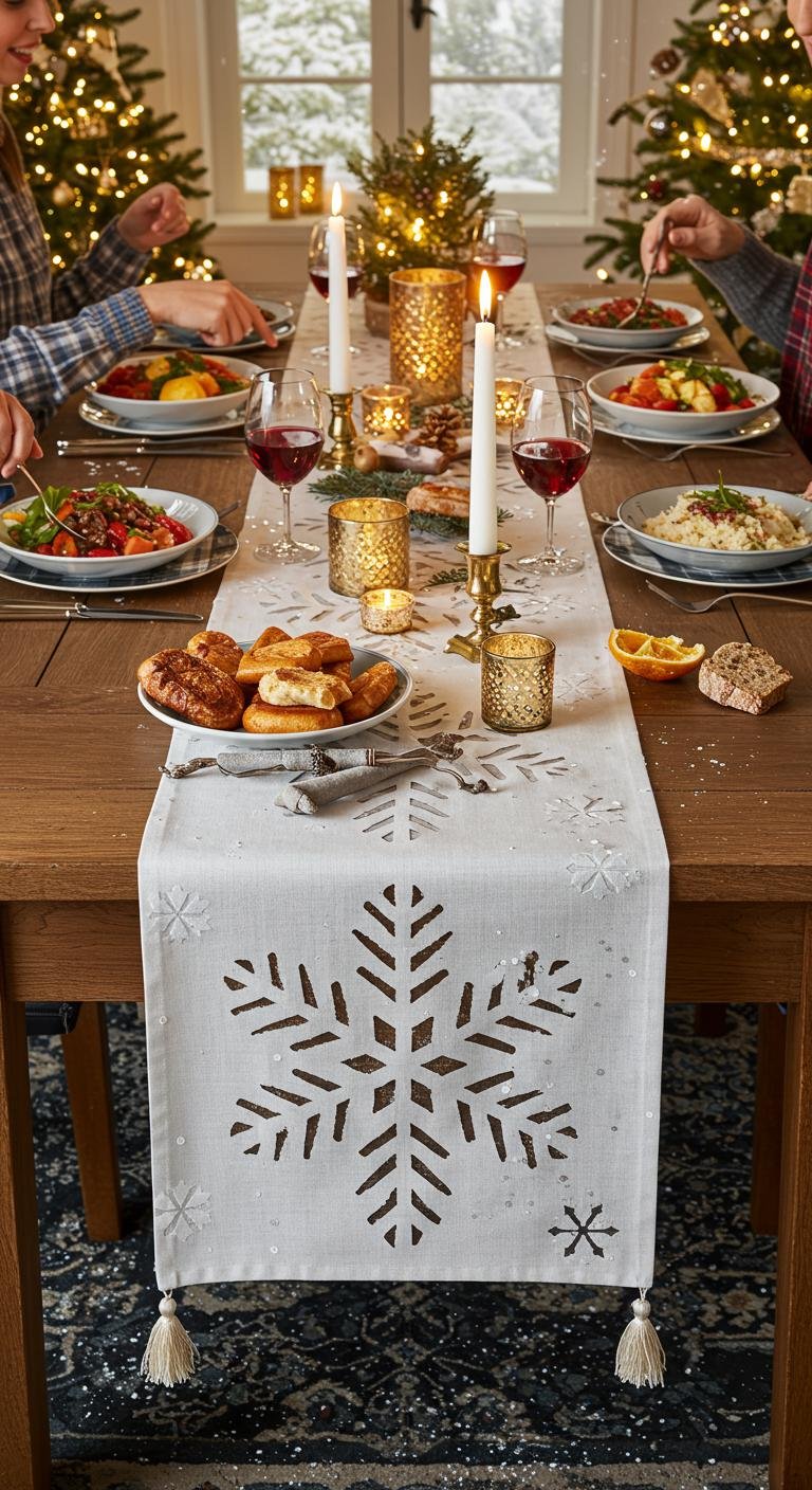 After embracing the cozy charm of tartan, consider adding a touch of winter wonder with a snowflake stenciled white runner. This DIY project features beautiful snowflake design ideas that transform your table into a winter theme inspiration. With a few simple materials, you can create a stunning centerpiece that captivates guests and sets a festive tone for your holiday gatherings.