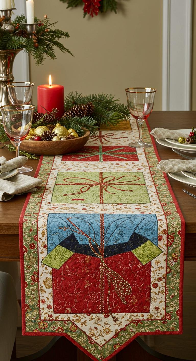 Imagine transforming your dining table into a stunning centerpiece with a Stitched Gift-Wrapped Table Runner that adds a touch of charm and creativity. By using various gift wrap techniques and vibrant fabrics, you can create beautiful stitched designs that mimic the excitement of unwrapping presents. This runner not only showcases your crafting skills but also elevates your holiday décor with a unique flair.