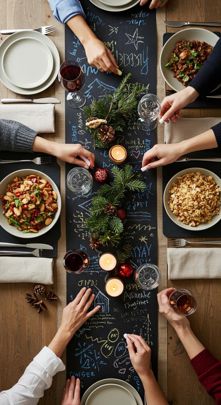 Create a unique touch at your holiday gatherings with a Chalkboard Paint Table Runner. Release your chalkboard creativity by inviting guests to write festive messages directly on the table runner! This interactive element not only personalizes your dining experience but also sparks joyful conversations. Grab some chalk, let those ideas flow, and watch your table transform into a canvas of holiday cheer!
