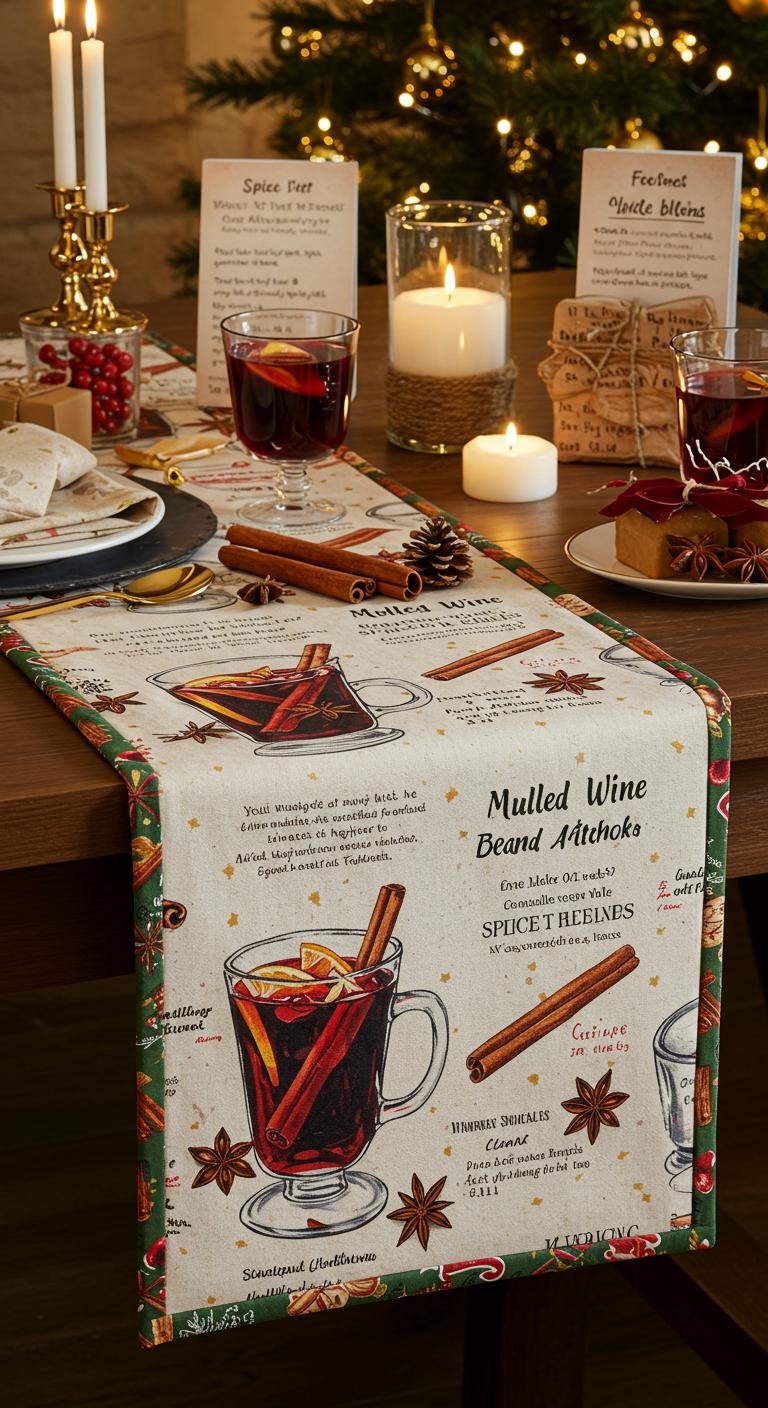 To create a runner inspired by this warmth, consider using festive fabrics adorned with cinnamon sticks and star anise.