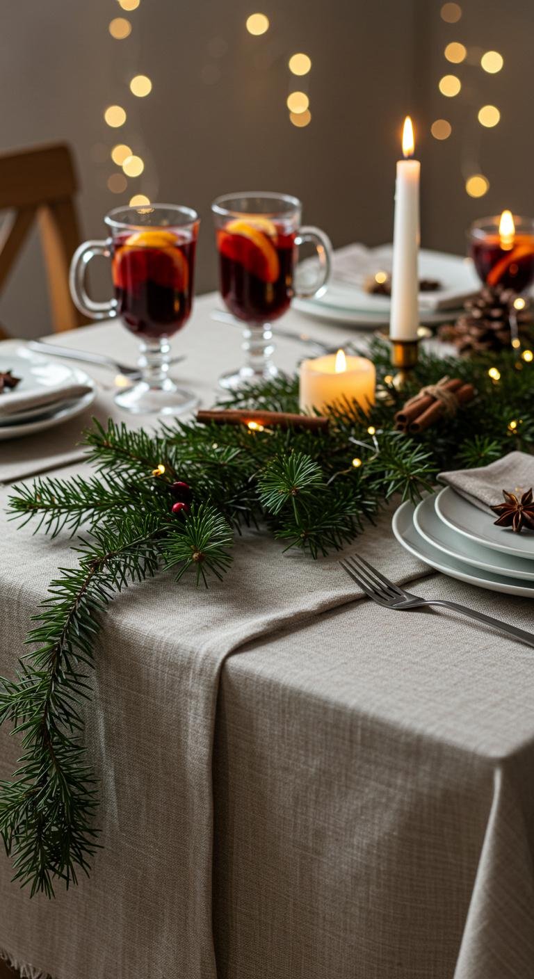 As the cozy warmth of mulled wine and spices fills your home, consider embracing the beauty of nature with a pine branch-themed table runner. This rustic holiday elegance brings the outdoors in, transforming your dining experience. Simply layer fresh pine branches over a neutral tablecloth, and watch as your space bursts with charm. It’s an effortless way to celebrate the season in style!