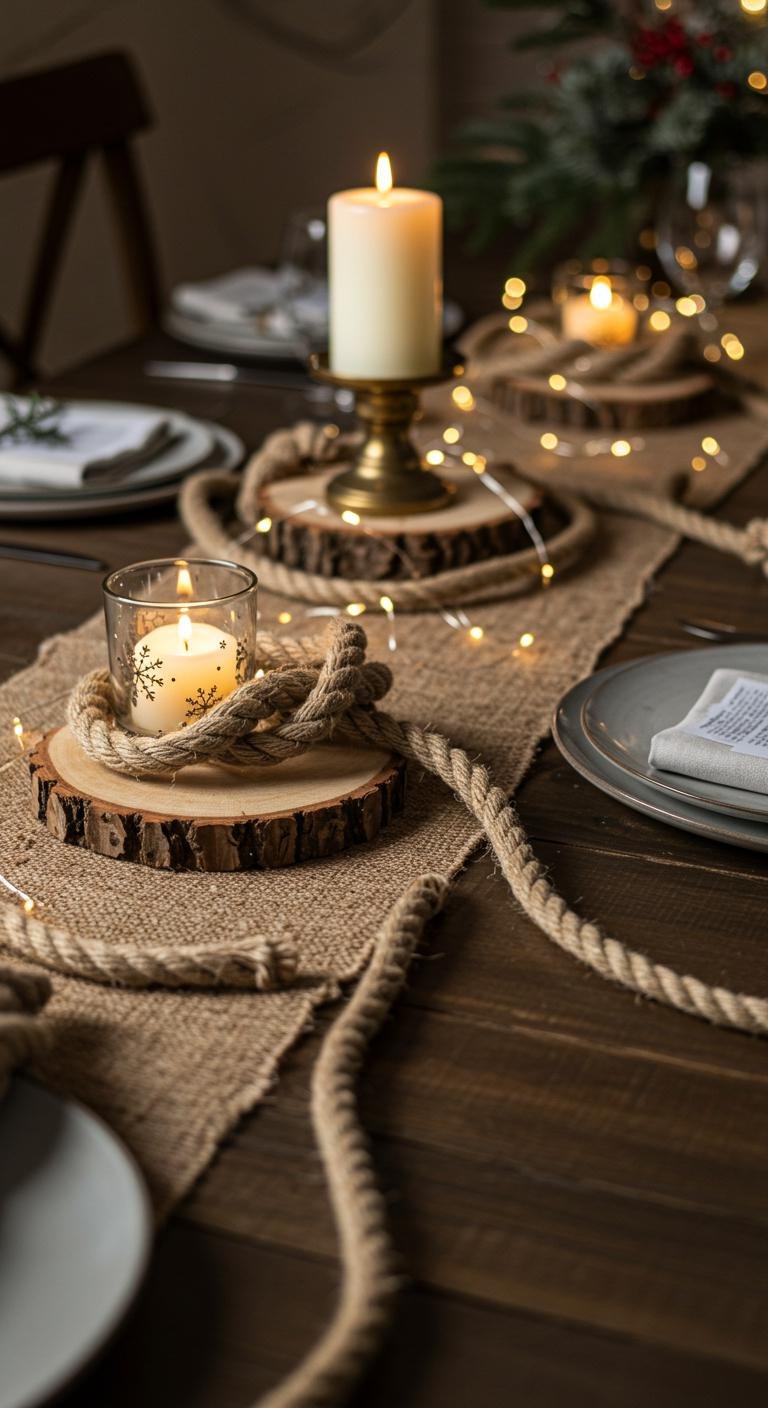If you’re looking to add a touch of rustic charm to your holiday table, a knotted rope and wood slice runner is a creative option that effortlessly blends warmth and texture. Simply tie together sections of knotted rope and pair them with elegant wood slices for a unique focal point. This easy DIY project gives your dining experience a cozy, inviting vibe perfect for holiday gatherings!