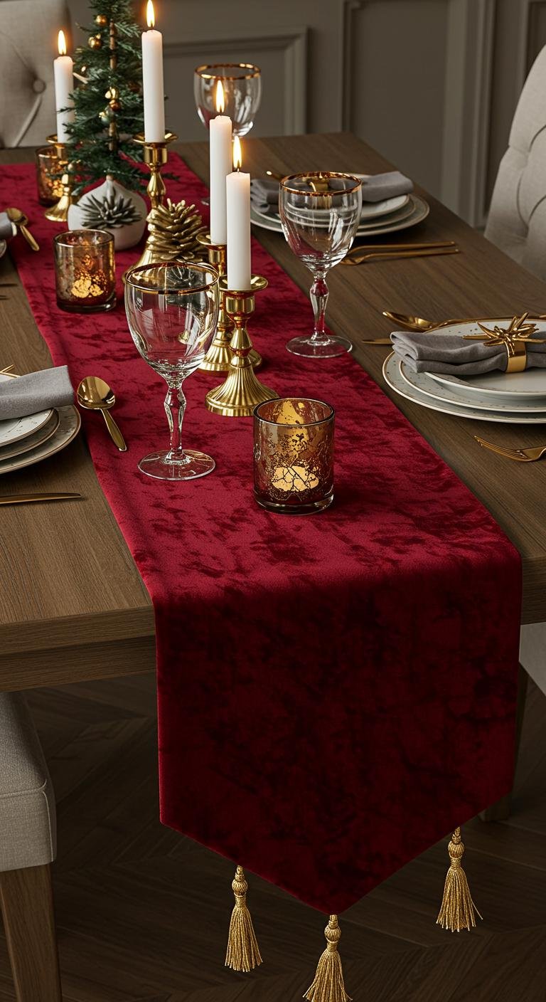 Create a luxurious dining experience this holiday season with a stunning red velvet table runner. Its rich texture instantly elevates your table setting, making every meal feel special.