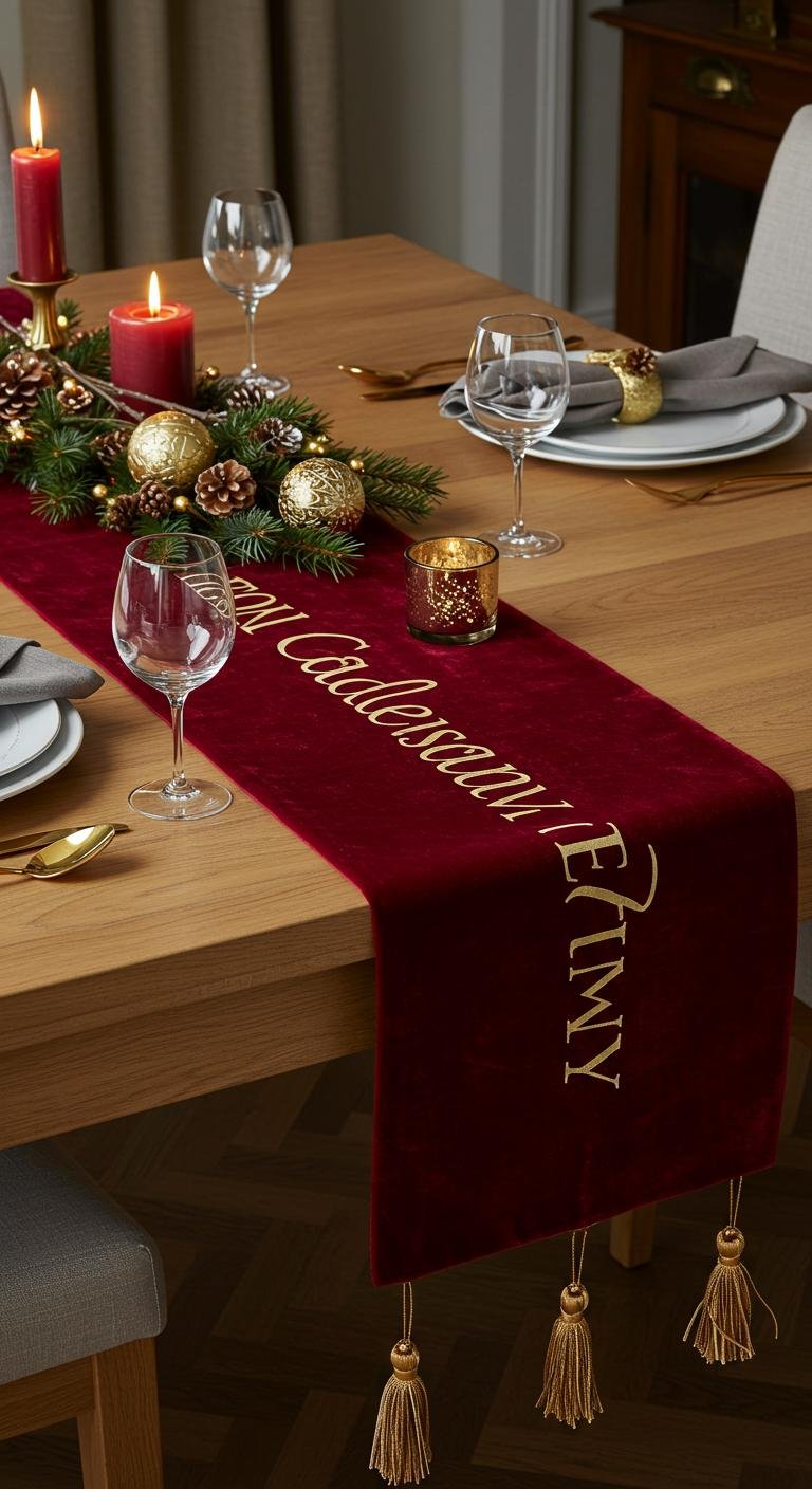 After setting the mood with a luxurious red velvet table runner, why not make your dining experience even more special with a personalized family name runner?